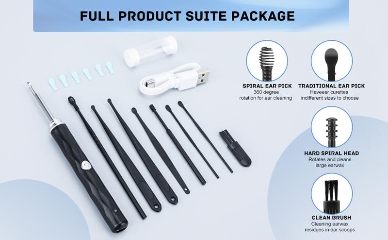 The kit features a light ear camera for precise ear wax removal. The 6 ear spoons offer versatile options for different ear sizes. The flashlight provides additional lighting during use. This set is designed to enhance your ear care routine efficiently. It's a comprehensive solution for maintaining clean ears.